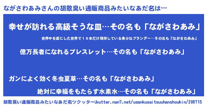 | 男性向けラノベタイトル風あだ名 | 『ながさわあみ~年齢イコール彼女いない歴の魔法使い~』 |