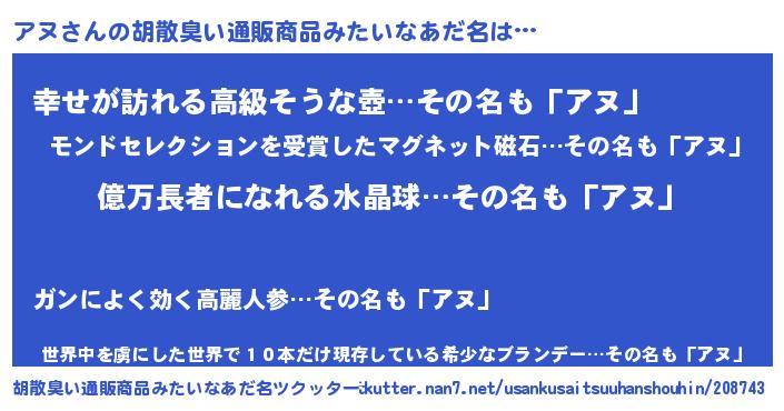 | ヘコむあだ名 | 『アヌもー』『牛乳』『アヌ(震え声)』 |