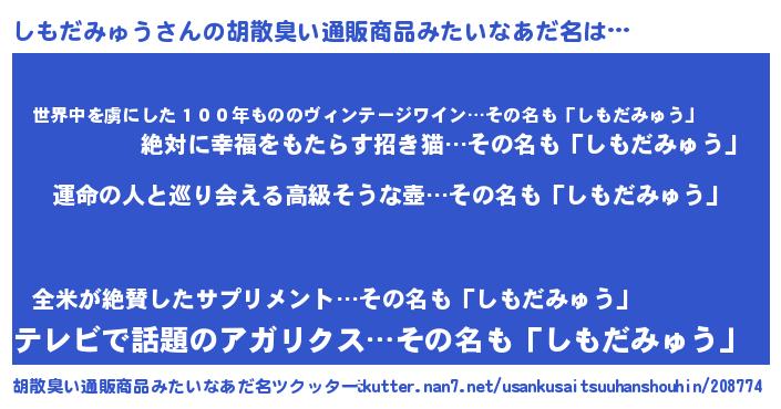 | 欧米人風あだ名 | 『しもだみゅうクリステル』 |