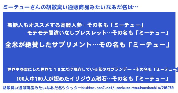 | 女子向けラノベタイトル風あだ名 | 『ミーテュー様がみてる』 |