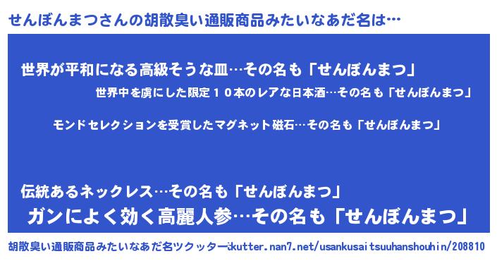 | 男性向けラノベタイトル風あだ名 | 『せんぼんまつに滅ぼされるだけの簡単なお仕事です』 |