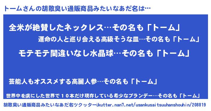 | 男性向けラノベタイトル風あだ名 | 『トームの憂鬱』『魔弾の王とトーム』 |
