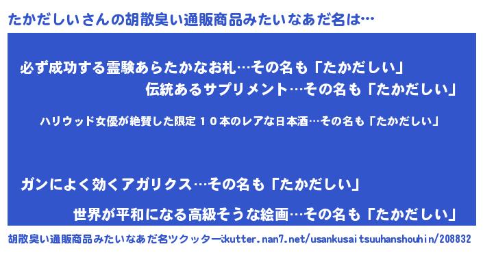 | ヒーロー風カッコイイあだ名 | 『仮面タカダー』『スーパータカダシイ』 |