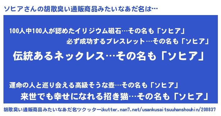 | ヘコむあだ名 | 『ソヒっ子』『ソヒア(爆)』『牛乳』 |