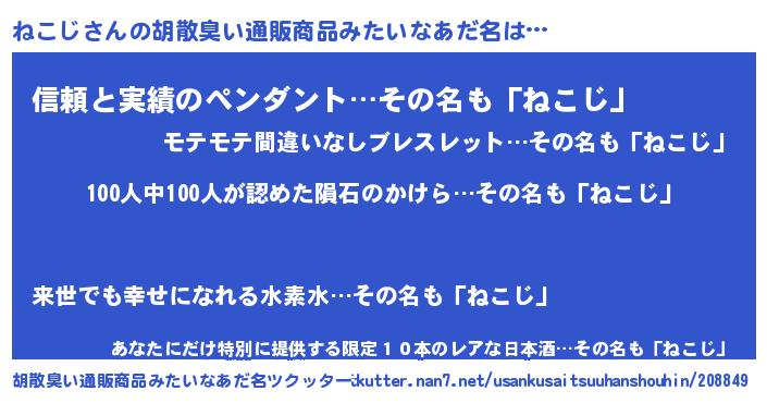 | 欧米人風あだ名 | 『ダニエルねこじ』『アンジェラ・ねこじ』 |