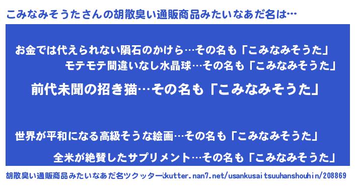 | ヘコむあだ名 | 『こみなみそうた(笑)』『こみぷりん』 |
