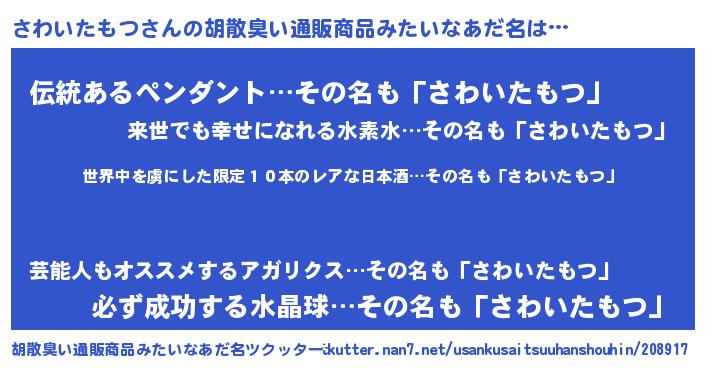 | 意味不明あだ名 | 『住所不定無職さわいたもつ(53歳)』 |