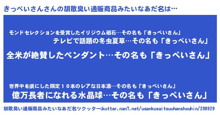 | 男性向けラノベタイトル風あだ名 | 『うちのきっぺいさんが世界を掌握している!』 |