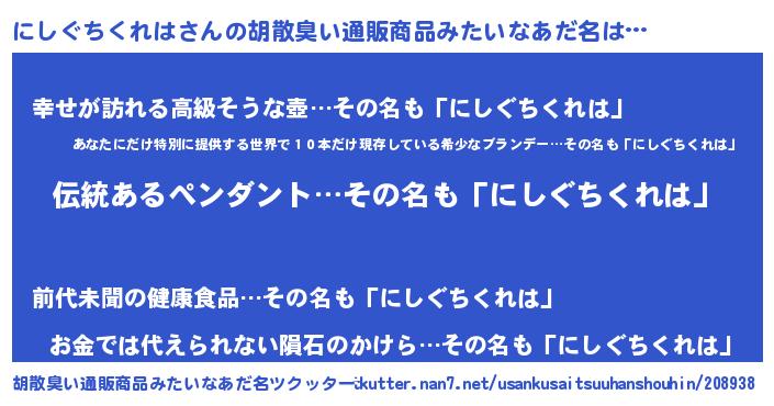 | 欧米人風あだ名 | 『ウサインにしぐちくれは』 |