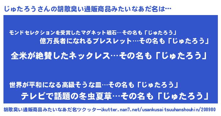 | 男性向けラノベタイトル風あだ名 | 『じゅたろう~年齢イコール彼女いない歴の魔法使い~』 |