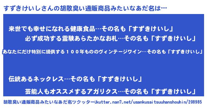 | ヘコむあだ名 | 『すずきけいし(小並感)』『すずもー』 |