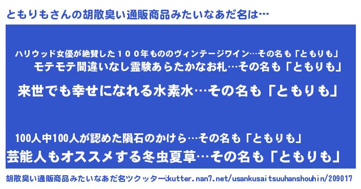 | 男性向けラノベタイトル風あだ名 | 『ともりもという概念が存在しない退屈な世界 』 |
