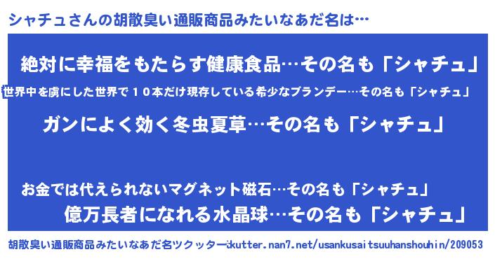 | 意味不明あだ名 | 『自称シャチュ』『永久保存シャチュ』 |