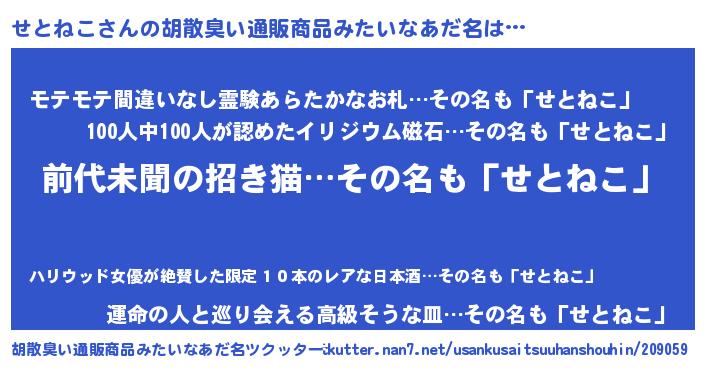 | 意味不明あだ名 | 『永久保存せとねこ』『ペロリンせとねこ』 |