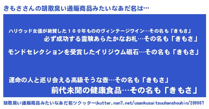 | 女子向けラノベタイトル風あだ名 | 『死神きもさの再婚』『きもさの契約王妃』 |