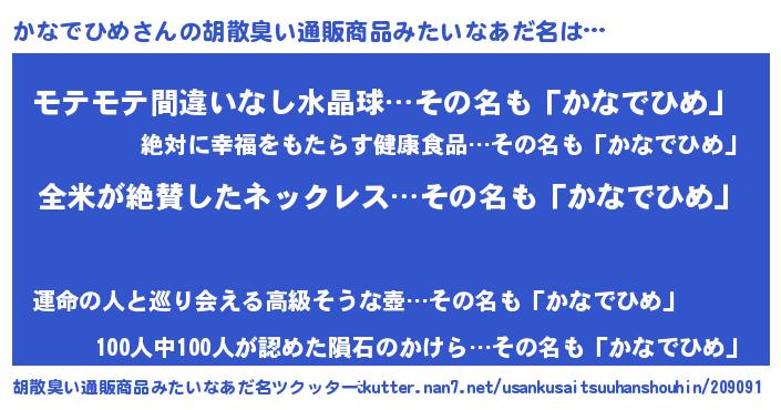 | 男性向けラノベタイトル風あだ名 | 『かなでひめの嫁は女の子じゃないと思った?』 |