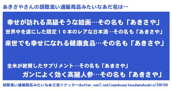 | ヘコむあだ名 | 『あきさや(爆)』『牛乳』『あきお』 |