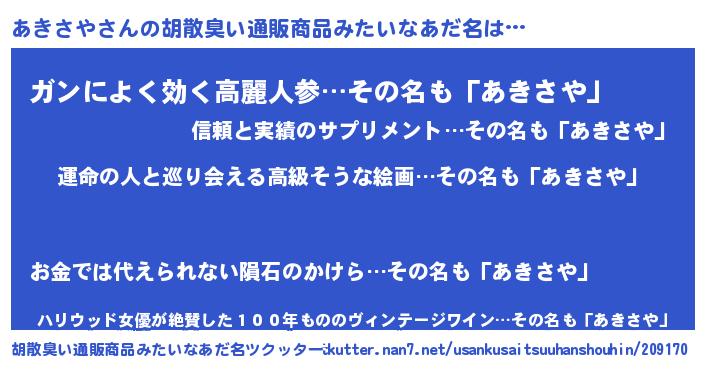 | ヘコむあだ名 | 『酢こんぶ』『あきっ子』『あきにー』 |