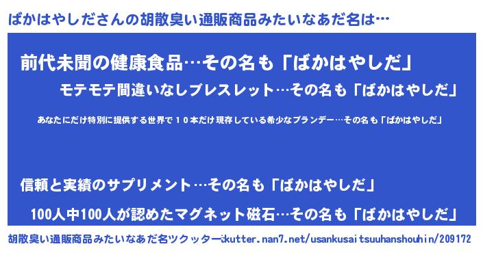 | 意味不明あだ名 | 『住所不定無職ばかはやしだ(86歳)』 |