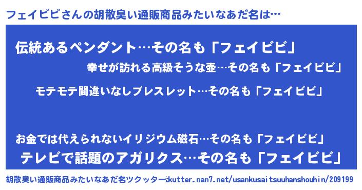 | ヘコむあだ名 | 『フェにー』『フェ太郎』『なまこ酢』 |