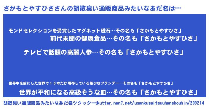 | 男性向けラノベタイトル風あだ名 | 『さかもとやすひさに滅ぼされるだけの簡単なお仕事です』 |