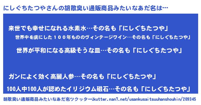 | ヘコむあだ名 | 『豆乳』『にしぐちたつや(苦笑)』 |