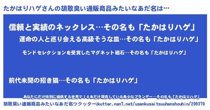 | ヒーロー風カッコイイあだ名 | 『天空の使者たかはりハゲ』 |