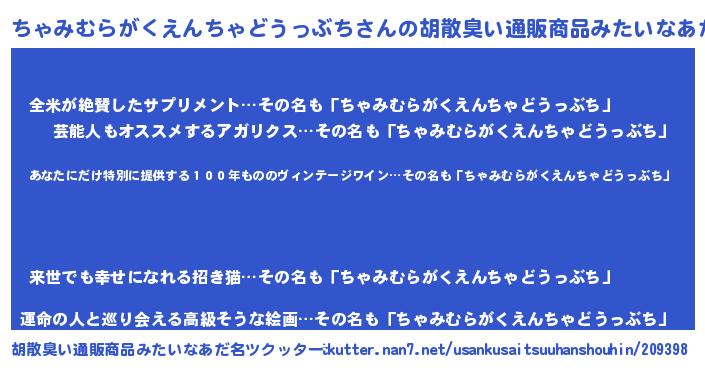 | 意味不明あだ名 | 『住所不定無職ちゃみむらがくえんちゃどうっぶち(9歳)』 |