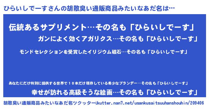 | 男性向けラノベタイトル風あだ名 | 『ひらいしでーすに滅ぼされるだけの簡単なお仕事です』 |