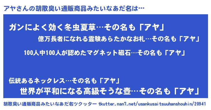 | 男性向けラノベタイトル風あだ名 | 『おまえをオタクにしてやるから、俺をアヤにしてくれ! 』 |