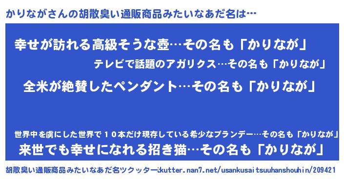 | ヘコむあだ名 | 『かりっぺ』『牛乳』『かりなが(笑)』 |