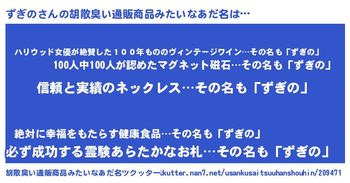 | 男性向けラノベタイトル風あだ名 | 『緋弾のズギノ』『魔弾の王とずぎの』 |