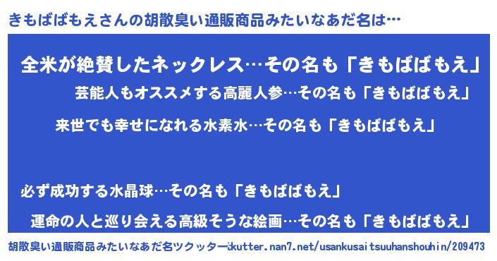 | 意味不明あだ名 | 『永久保存きもばばもえ』 |