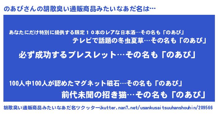 | 男性向けラノベタイトル風あだ名 | 『はたらくのあぴさま!』『のあぴの憂鬱』 |