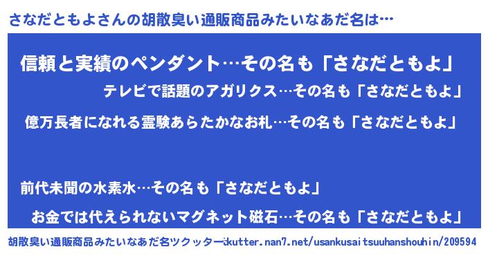 | ヒーロー風カッコイイあだ名 | 『スーパーサナダトモヨ』『暗黒騎士サナ』 |