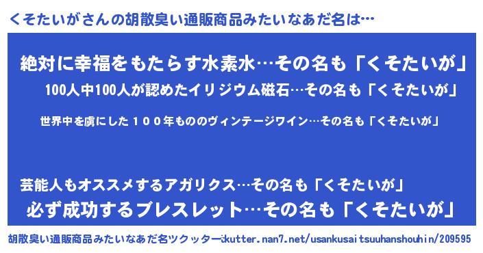 | 意味不明あだ名 | 『住所不定無職くそたいが(4歳)』 |