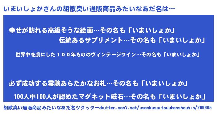 | 男性向けラノベタイトル風あだ名 | 『いまいしょかに滅ぼされるだけの簡単なお仕事です』 |