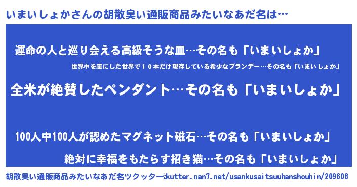| 男性向けラノベタイトル風あだ名 | 『いまいしょかの嫁は女の子じゃないと思った?』 |