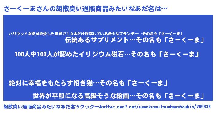 | 男性向けラノベタイトル風あだ名 | 『おまえをオタクにしてやるから、俺をさーくーまにしてくれ! 』 |