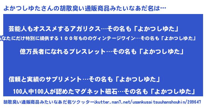 | 恥ずかしいあだ名 | 『プリティーよかつしゆた』『よかっちょ』 |