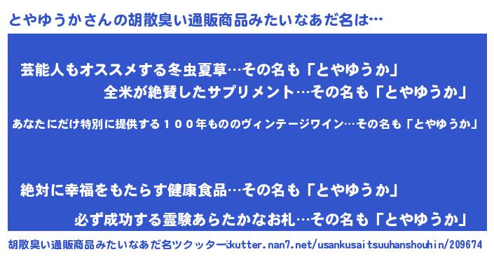 | 男性向けラノベタイトル風あだ名 | 『とやゆうか~年齢イコール彼女いない歴の魔法使い~』 |