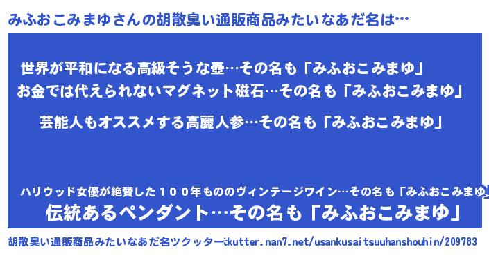 | 意味不明あだ名 | 『自称みふおこみまゆ』 |
