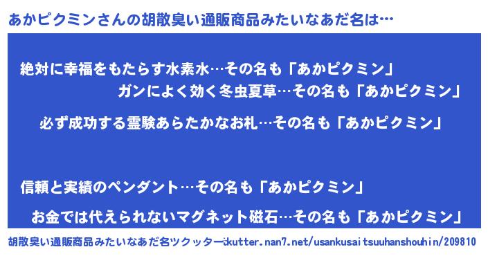 | 男性向けラノベタイトル風あだ名 | 『あかピクミンの憂鬱』 |