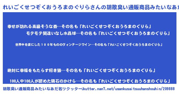 | 意味不明あだ名 | 『住所不定無職れいごくせつぞくおうろまのぐりら(5歳)』 |