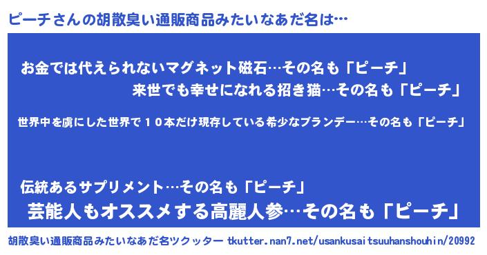 | 意味不明あだ名 | 『もやし科ピーチ属』『自称ピーチ』 |