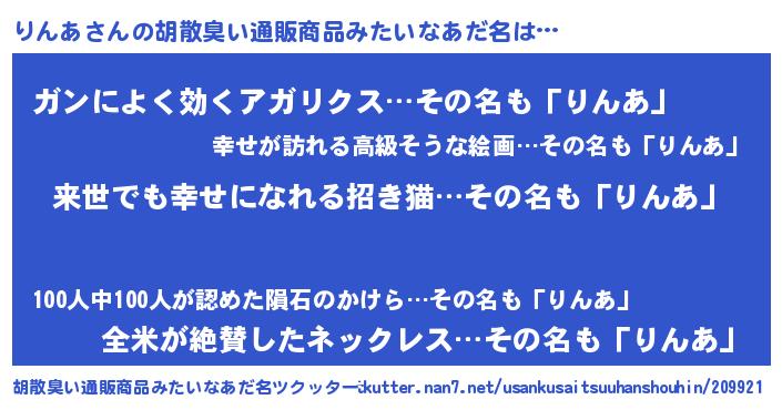 | 意味不明あだ名 | 『永久保存りんあ』『自称りんあ』 |