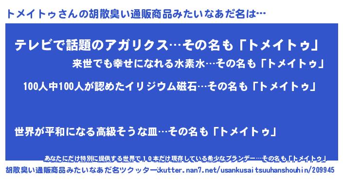 | 男性向けラノベタイトル風あだ名 | 『おまえをオタクにしてやるから、俺をトメイトゥにしてくれ! 』 |