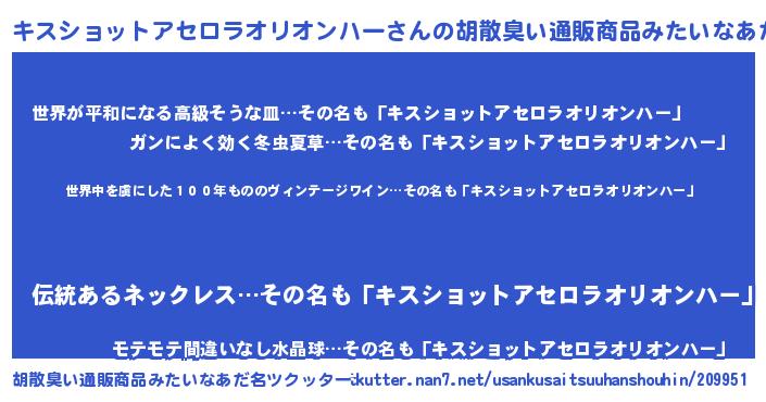 | 意味不明あだ名 | 『住所不定無職キスショットアセロラオリオンハー(6歳)』 |