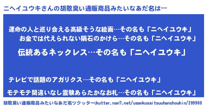 | 欧米人風あだ名 | 『ウサインニヘイユウキ』 |