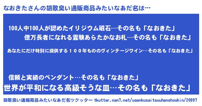 | 男性向けラノベタイトル風あだ名 | 『この素晴らしい世界になおきたを!』 |